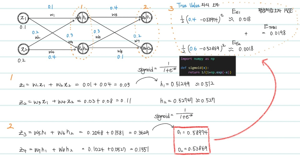 위는 Back Propagation이 있기전의 Feed Forwarding의 과정이다. 먼저, 검정,파랑색으로 적혀있는 수들은 최초에 임의의값으로 초기화됨을 의미한다.
