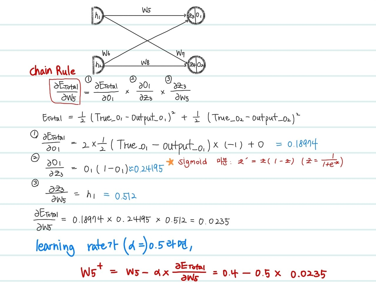 - output layer상에서도 마찬가지로 hidden layer를 지나 발생한 , 값을 output layer의 input으로 입력한뒤, sigmoid 함수를 거쳐 최종 output value를 산출한다.