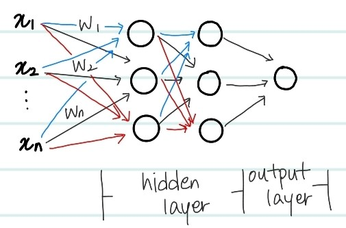 - 각각 weight와 input을 곱하여 hidden layer의 노드에 해당하는 값들을 더한 뒤, sigmoid함수(activation)를 취한다.