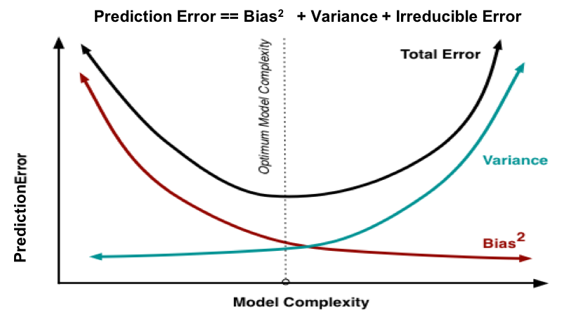 이 그래프는 model의 complexity와 Bias,Variance의 관계를 나타낸다. complexity가 클수록 Bias는 작아지고 Variance는 높아지는 것을 알 수 있다. 사실 당연한 이야기이다. model이 복잡할수록, 더 train data에 대해서 잘 학습하게 된다. 무조건 잘 학습된다고 좋지않다. 너무 잘 학습하게 되기 때문이다.