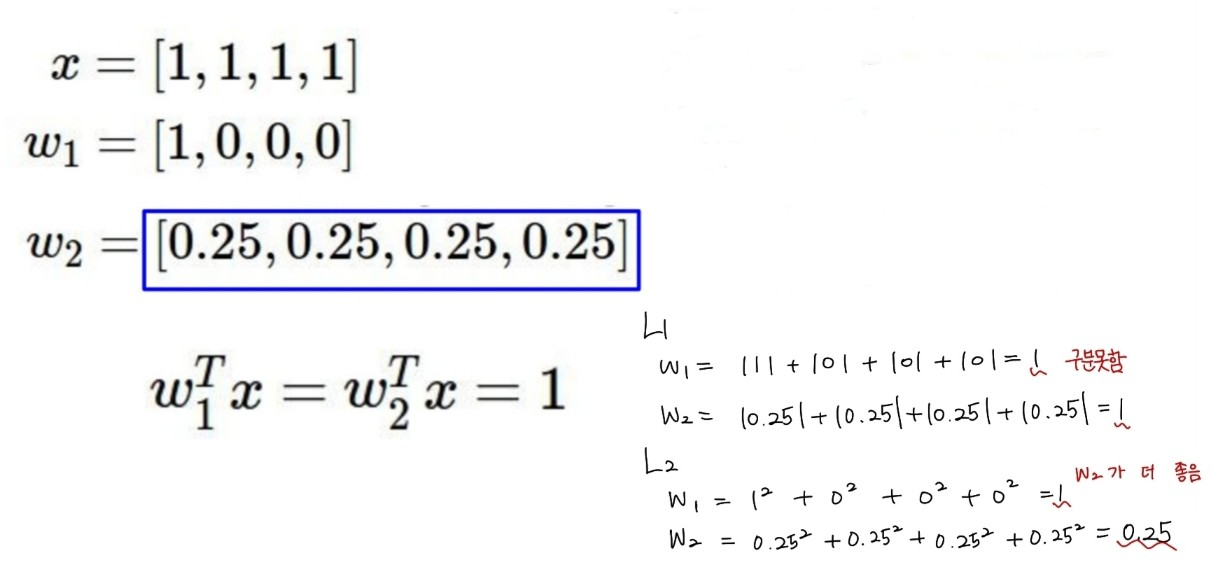 간단한 예시일 수 있지만, 위의 사진에서는 이 보다 더 균등하게 가중치가 분포한 더 옳은 예시임을 알 수 있다. 이를 L1 규제를 계산해보고, L2 규제를 계산해보았을때 loss function에 더해지는 값을 위와 같이 계산 할 수 있다. L1 규제를 사용했을 때 둘의 차이를 내지 못한 반면, L2 규제에선 가 더 올바른 weight 분포임을 알게 해준다.