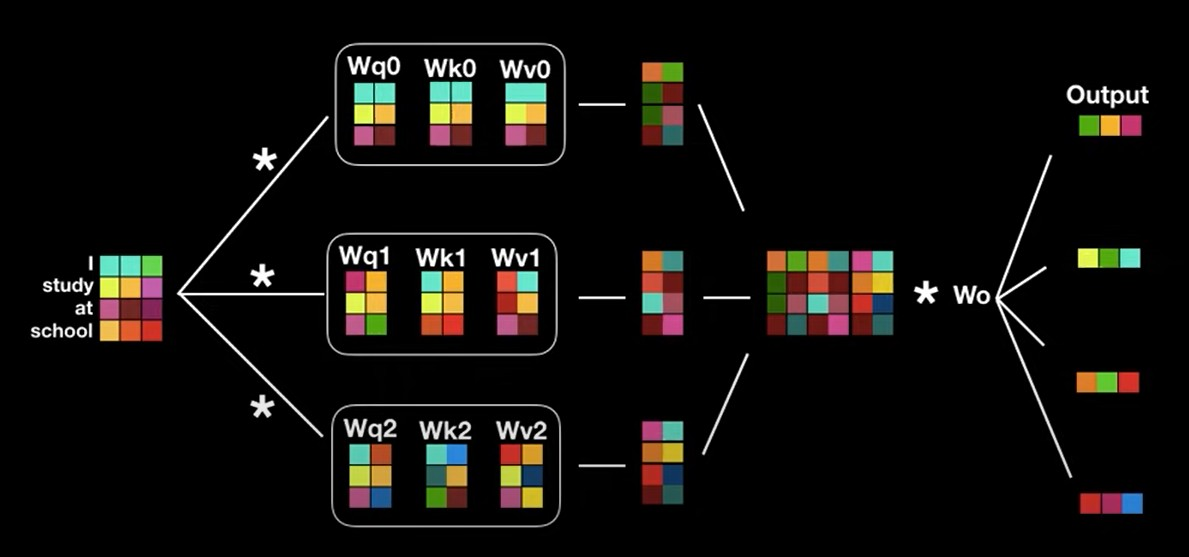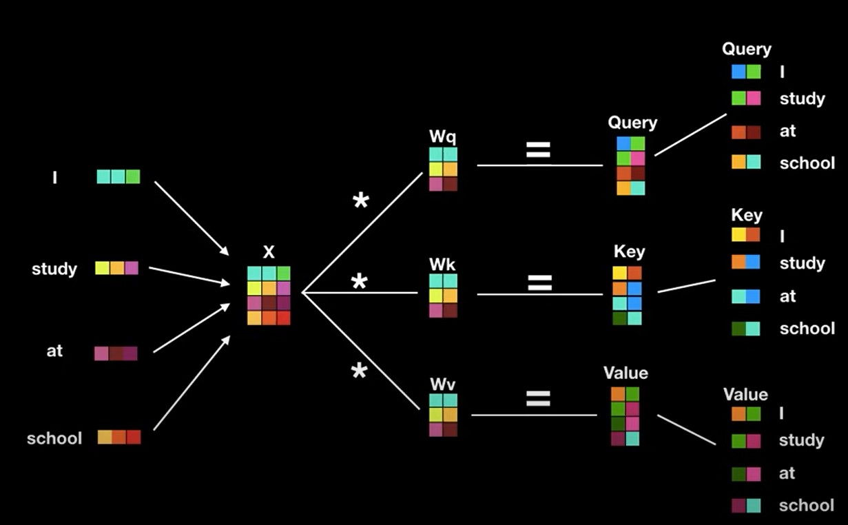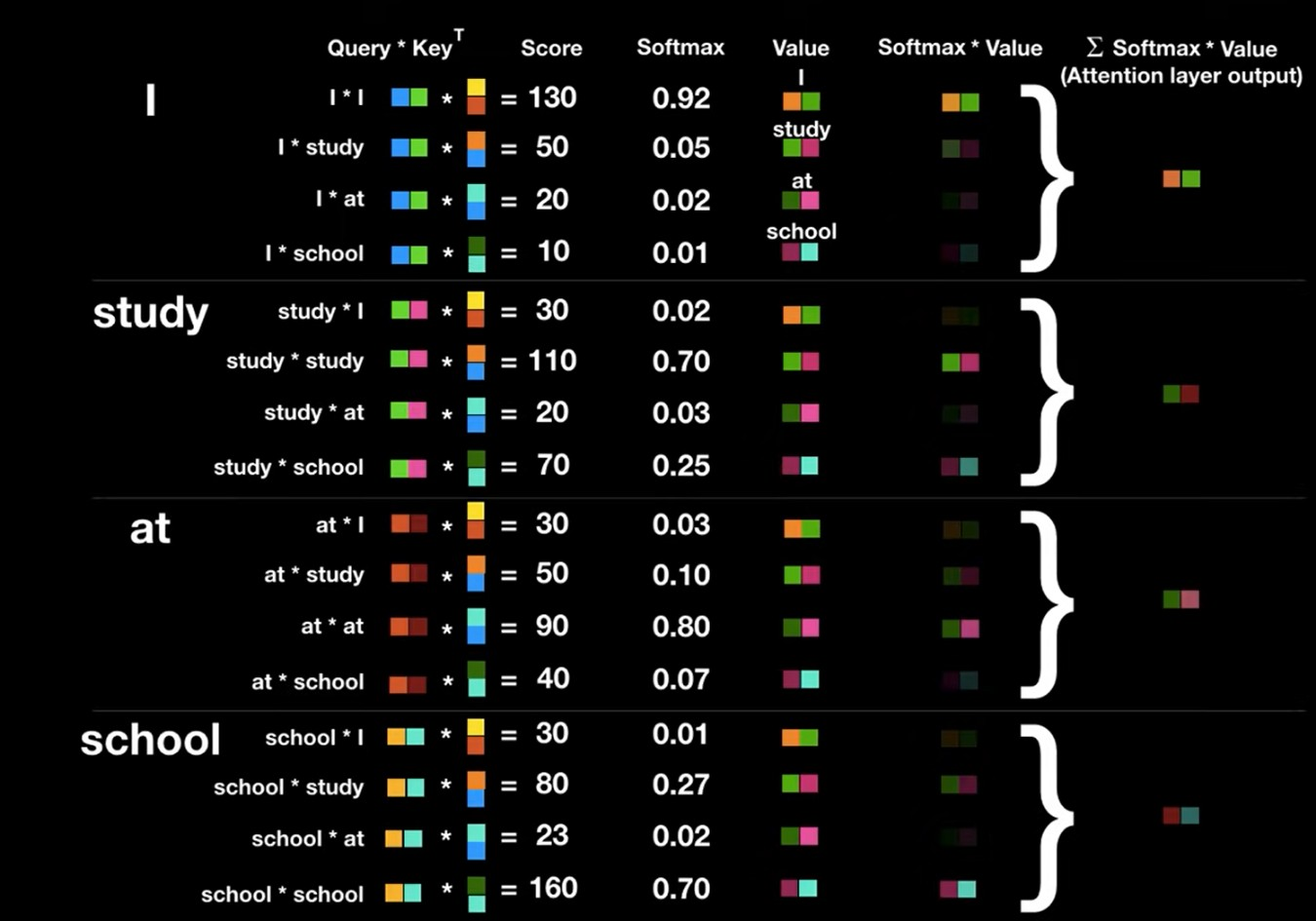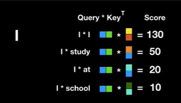 Key: I, am, a, teacher위의 그림을 통해 알 수 있듯이, Query값과 Key값의 내적을 통해서 scalar값이 나오는것을 알 수 있다. 사진에는 나와있지않지만, 내적 output값들을 softmax 취하며 각 관계중에서 어떤 관계가 가장 높은 점수를 가지는지 나타낸다. 마지막으로 value vector를 softmax output인 scalar값과 곱해 단어의 value 뿐 아니라 attention 값도 포함한 vector를 얻게 된다.