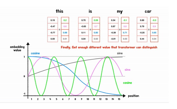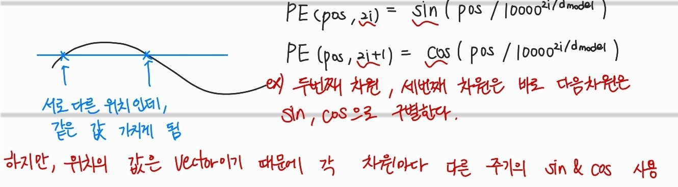 sin함수와 cos함수도 계속 같은 주기의 함수를 사용하면, 다른 위치의 값에 대해 같은 vector값을 가질 수 있기 때문에, 각 차원마다 서로 다르주기의 sin과 cos함수를 사용해서 모두 다른 위치벡터값이 나오게끔해서 positional embedding을 수행한다.