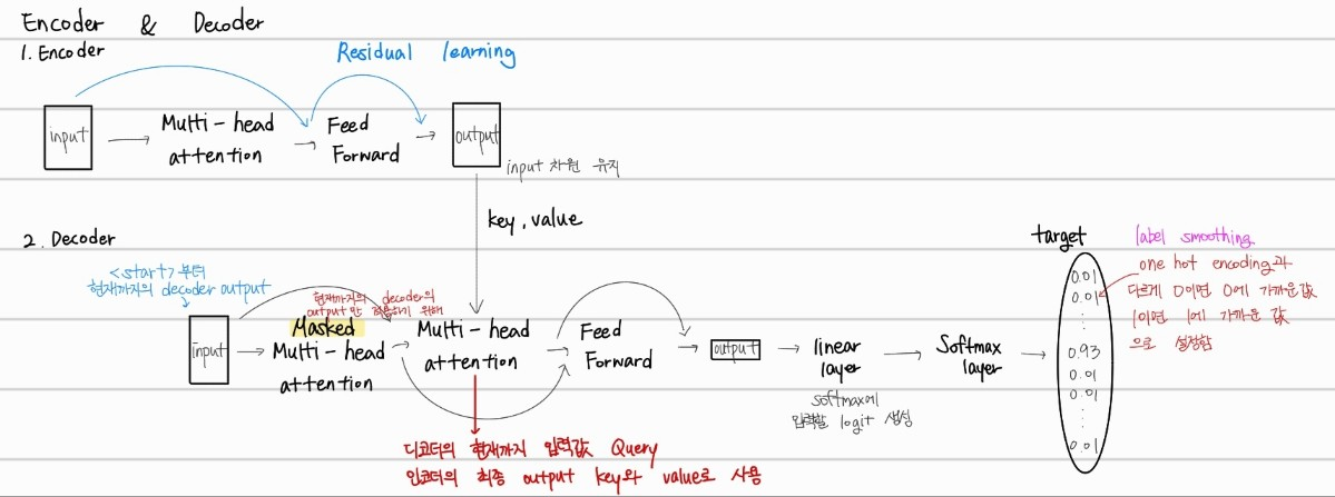 디코더에서는 Masked Multi-head-attention이 사용되는 것을 알 수 있다. 이는 현재까지 decoder의 output인 값들만 적용하기 위해서 masking처리를 한것이다. 또한, Multi-head-attention에서는 디코더의 현재까지의 입력값을 Query로 하고 인코더의 최종 output key와 value를 사용해서 디코더의 output을 예측한다. 또한, one hot encoding을 label smoothing을 통해서 0은 0에 가까운 어떠한 수 1이면 1에 가까운 어떠한 수로 softmax 결과값이 나오게 한다. 그 이유는, 예측확률이 정확도에 더 잘 정렬할 수 있게 하기 위해서 이다.