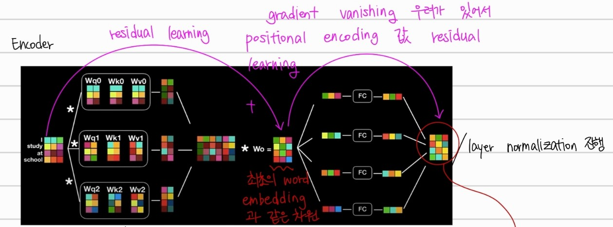위는 한개의 인코더 구조를 설명한 것이다 위와 같은 구조의 인코더 계층이 여러개 붙어 있는 구조가 트랜스포머의 인코더 구조이다. 여기서 각 인코더 계층은 다른 weight를 가진다. 또한 input vector가 여러 인코더를 지나며 gradient vanishing 문제가 생길 수 있어 residual learning을 사용한다.