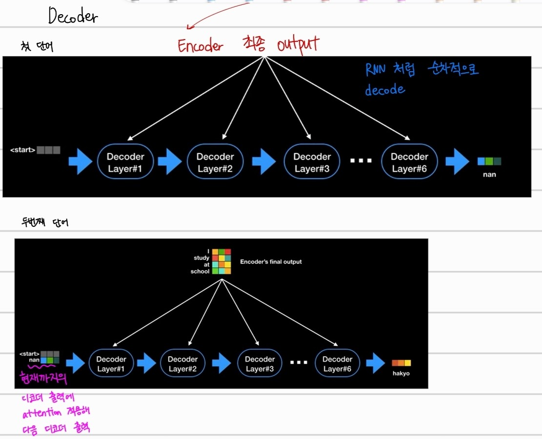 디코더는 RNN과 동일하게 한개의 단어씩 생성된다. 먼저 start를 입력으로 받고, "난"으로 번역한 뒤 그다음 단어를 예측할때는 현재까지의 디코더 출력에 attention을 적용해서 다음 디코더의 출력값을 예측한다.