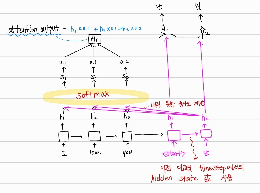 위의 사진을 예시로 보면, "I"라는 단어를 "난"으로 번역할때, <start> 토큰의 hidden state 값과 인코더에서의 각 hidden state 값을 내적하여 softmax 함수로 얼마나 비중을 둘지 스칼라로 계산하는 것을 알 수 있다.