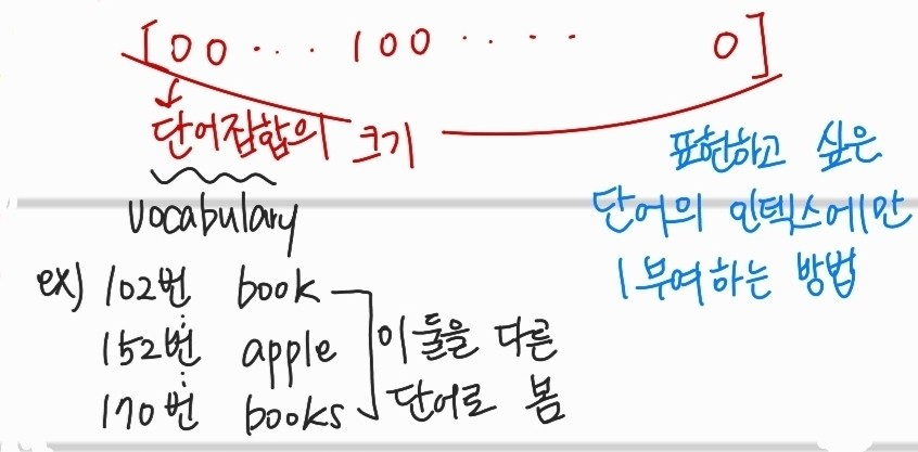 각 단어에 대해서 인덱스화하여 표현하고 싶은 단어의 인덱스만 1로 부여한다.