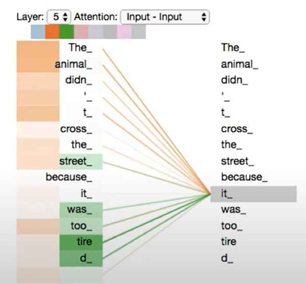 위의 사진과 같이 it 이라는 단어에 다양한 관점에서 바라본 attention layer를 적용해 animal과 tire이 큰 attention값을 가진다는것을 알 수 있다.