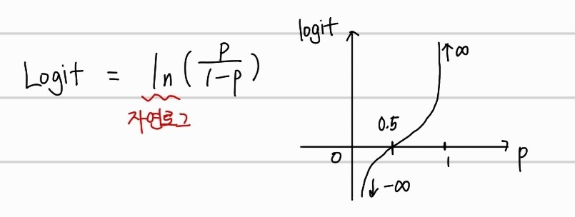 logit은 Odds에 자연로그를 씌운 것이다. 수식과 그래프는 아래와 같다.