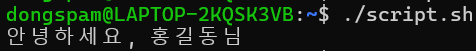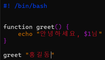 shell script에서는 함수를 정의하고 호출할 수 있다. greet 함수에 "홍길동"이라는 변수를 넣어 출력하게끔 했다. $1은 첫번째 위치의 인자임을 의미한다.
