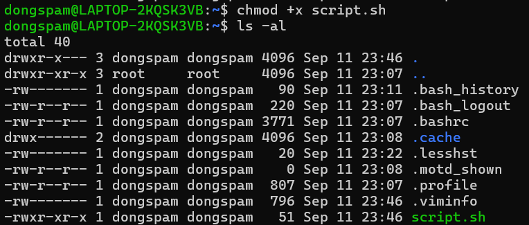 chmod 명령어를 통해서 script.sh의 권한을 변경하니, 실행 가능해진 것을 알 수 있다. +x는 r(읽기),w(쓰기),x(실행) 권한 중 실행 권한을 부여해준 것을 알 수 있다.