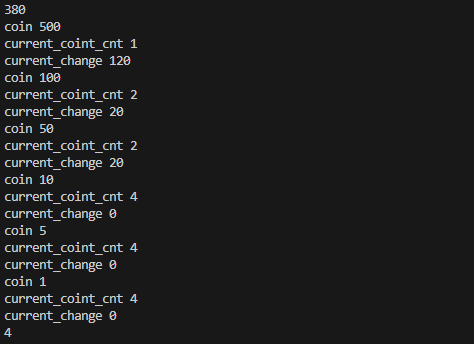또한, 앞에서 500엔으로 먼저 잔액을 계산했다고해서 이후에 100엔을 못선택하거나 하는 것도 아니다. 현재 잔돈에 맞춰서만 동전의 갯수를 정하면 되니 앞서 언급한 그리디 알고리즘의 두 조건을 모두 만족하는 문제임을 알 수 있다.