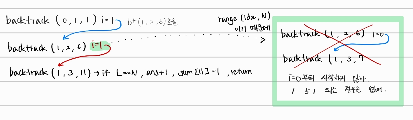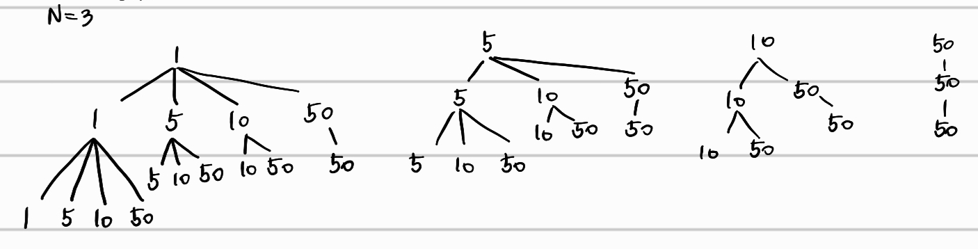 [1 5] 로 나오는 경우와 [5 1]로 나오는 경우가 같은 의미라는 것이다. (편의상 로마자는 숫자로 대체했습니다.)4.의 예시로 N이 3일때, [1 5] 로 시작하는 경우의 수를 탐색할때, 마지막에 1은 굳이 안가도 된다.[1 5 1]은 이미 [1]로 시작하는 경우에 존재하기 때문이다!![1 1 5]로 존재한다. 따라서, 우리는 선택하는 숫자들에 무조건 오름차순인 것으로 고르는 규칙을 세우도록 하자.