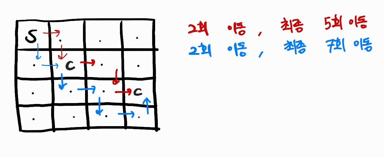 BFS 이동에 사용되는 Queue에 직전에 이동한 방향도 추가한다.두 개의 도착지 하나의 목적지로 도달하지 않고, 두 곳을 방문해야 종료되기 때문에, 이를 count할 변수가 필요하다.S → 첫번째 C인 가능한 가장 짧은 경로를 탐색한다. 그 이후에, 첫번째 C → 두번째 C 인 최단 경로를 탐색한다.