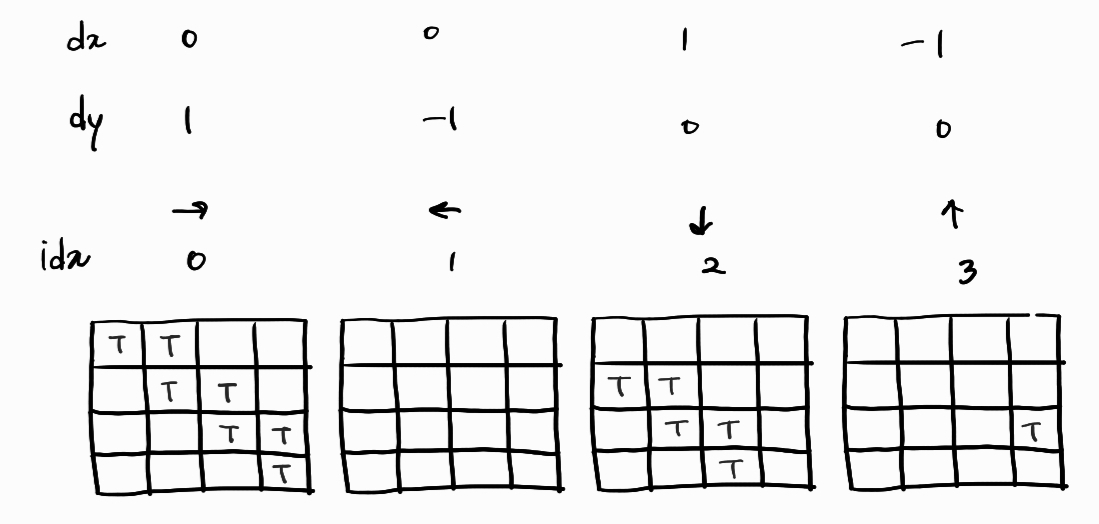 direction을 표현해야 한다. 동서남북으로 이동할때, 각각을 0,1,2,3으로 표현할 수 있다.