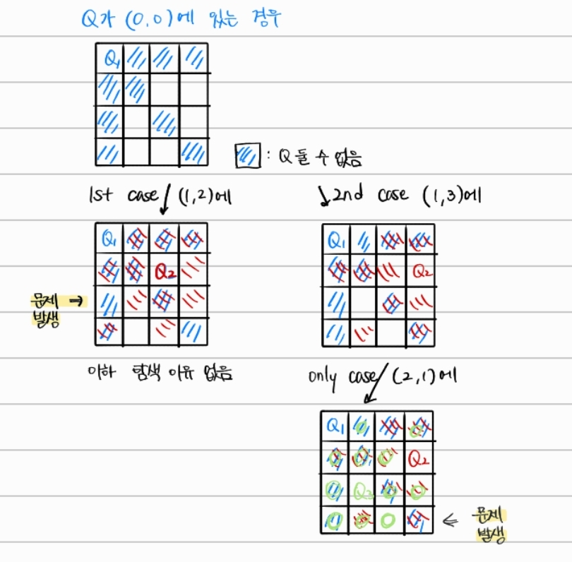처음으로, (0,0)에 Queen을 두게 되면 사진 속 파란색 칸에는 Queen을 둘 수 없게 된다.