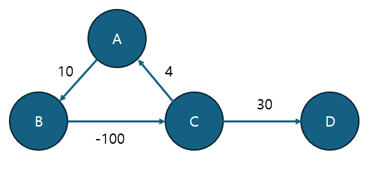 A에서 출발해 제자리로 돌아오면 음의 가중치가 되는 것을 알 수 있다. 이렇게 되면, 사실상 시작점 A를 제외한 모든 노드로의 최단거리는 음의 무한대가 된다. 한번의 cycle에서 -86이 되고, 한번 더 돌면, -172가 된다. 점점 음의 무한대에 가까워지게 가중치를 update할 수 있고, B,C,D까지 사실상 최단거리가 음의 무한대가 된다.