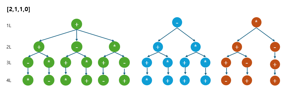 예를들어, 5개의 수에 대한 연산을 진행할때는 위와 같이 경우의 수를 계산할 수 있다. -로 시작하는 상황에서 2L로 오는 +가 사실 두개가 올 수 있지만, 둘다 똑같은 +일 뿐이다. (그래서, 트리가 홀쭉해지는 것)