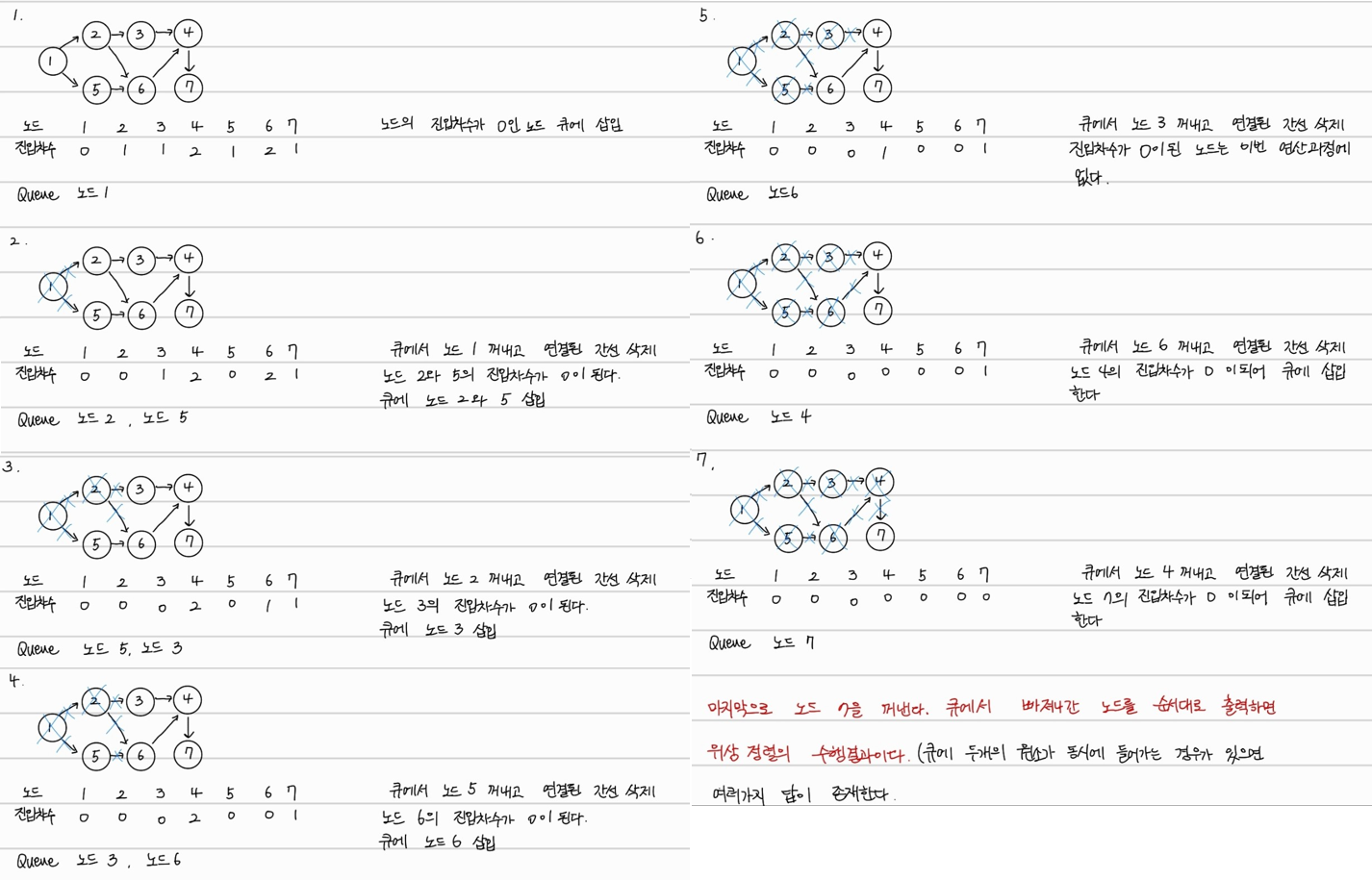 현재 진입차수가 0인 노드가 여러개 있어서 두개 이상의 노드를 한번에 큐에 입력하는 경우가 생긴다면, 어떤 노드를 먼저 넣는지에 따라서, 결과가 달라질 수 있다. 위의 예시에서도 2번 과정에서 2번 노드를 먼저 넣는지, 5번 노드를 먼저 넣는지에 따라 결과가 다르다