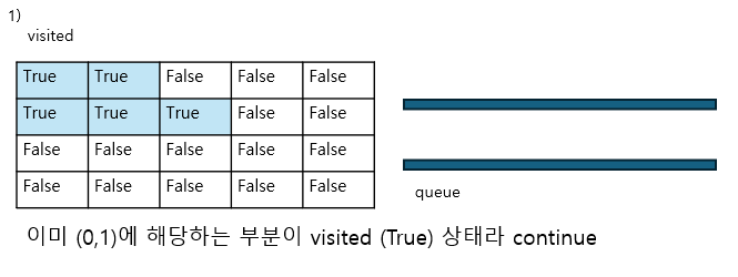 graph에서 0일 경우 visited에서 해당 위치를 True처리하면서 queue에 넣어준다. BFS 알고리즘을 모두 수행하면 5번과 같은 visited 상태가 된다. 그 후, 더이상 인접한 위치에 0이면서 visited=False인 위치가 없기 때문에 BFS 알고리즘 수행을 중단한다.