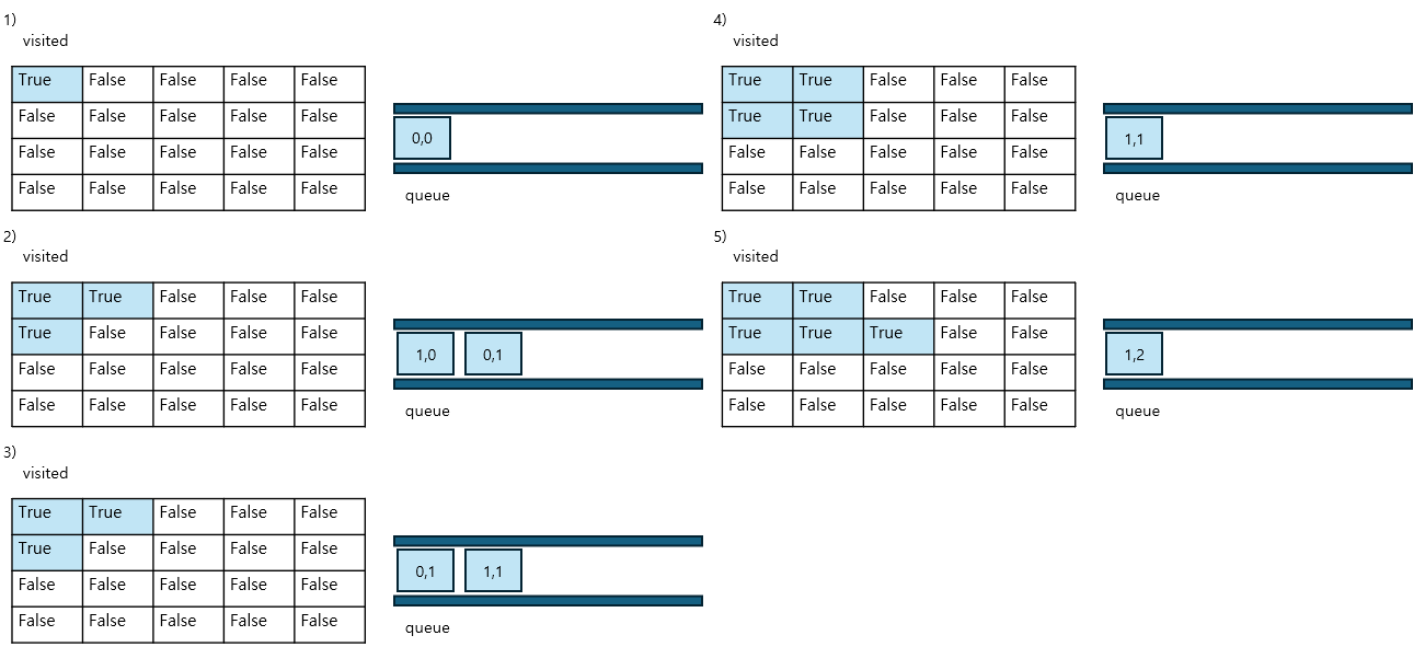 di,dj를 사용해 상하좌우로 이동하며 해당 위치가 graph에서 0에 해당하고 미방문 상태라면 visited에서 해당 위치를 True로 변경한 후, queue에 enque해 인접한 노드를 우선시하여 방문하는 BFS알고리즘을 구현했다. 예시로 시작 노드가 0,0인 경우와 0,1인 경우는 아래와 같이 차례대로 동작하게 된다.