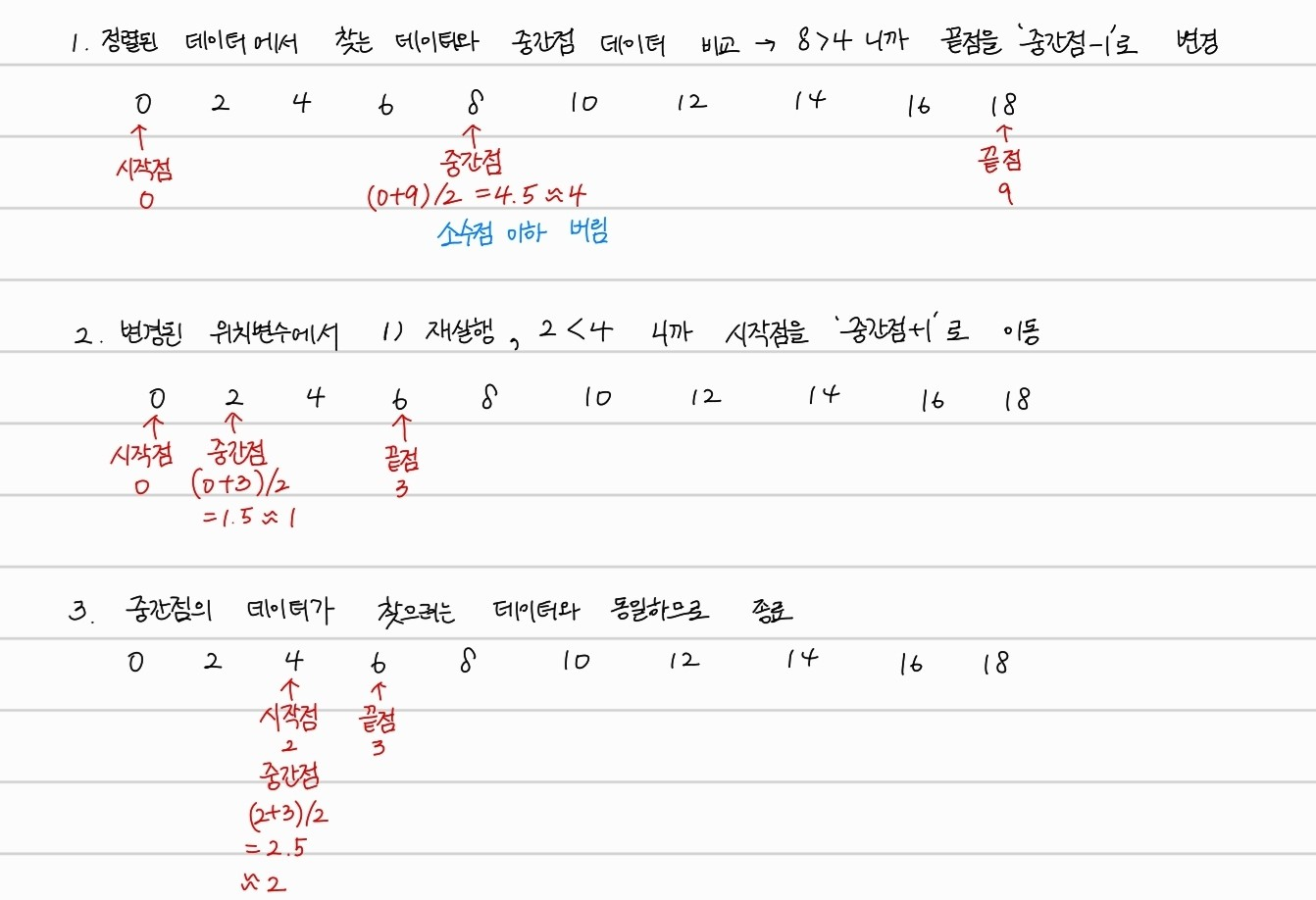 이진 탐색 알고리즘은 정렬된 데이터에만 적용할 수 있다. 데이터에서 시작점,중간점,끝점을 가리키는 변수를 사용하고, 찾으려는 데이터와 중간점 위치의 데이터를 반복적으로 비교하여 원하는 데이터를 찾는다. 다음은, 이진 탐색이 이루어지는 과정이다.