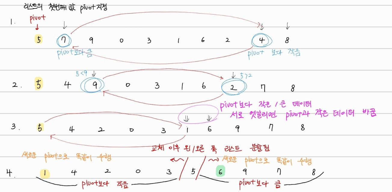 pivot값을 가운데로 두고, left side와 right side에 pivot값을 기준으로 나눈 값을 실제로 부여하며, list단위로 표현해 좀 더 직관적이게 구현도 가능하다.