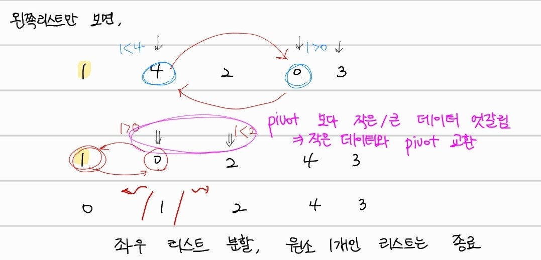 pivot을 기준으로 큰값과 작은 값을 모두 나눈 후에 pivot보다 작은 값들, 큰값들을 또 다시 퀵정렬을 처음부터 수행한다. 예를들어 좌측으로 나눠졌던 1,4,2,0,3 의 데이터에 대해선 아래와 같이 퀵 정렬이 이루어진다.