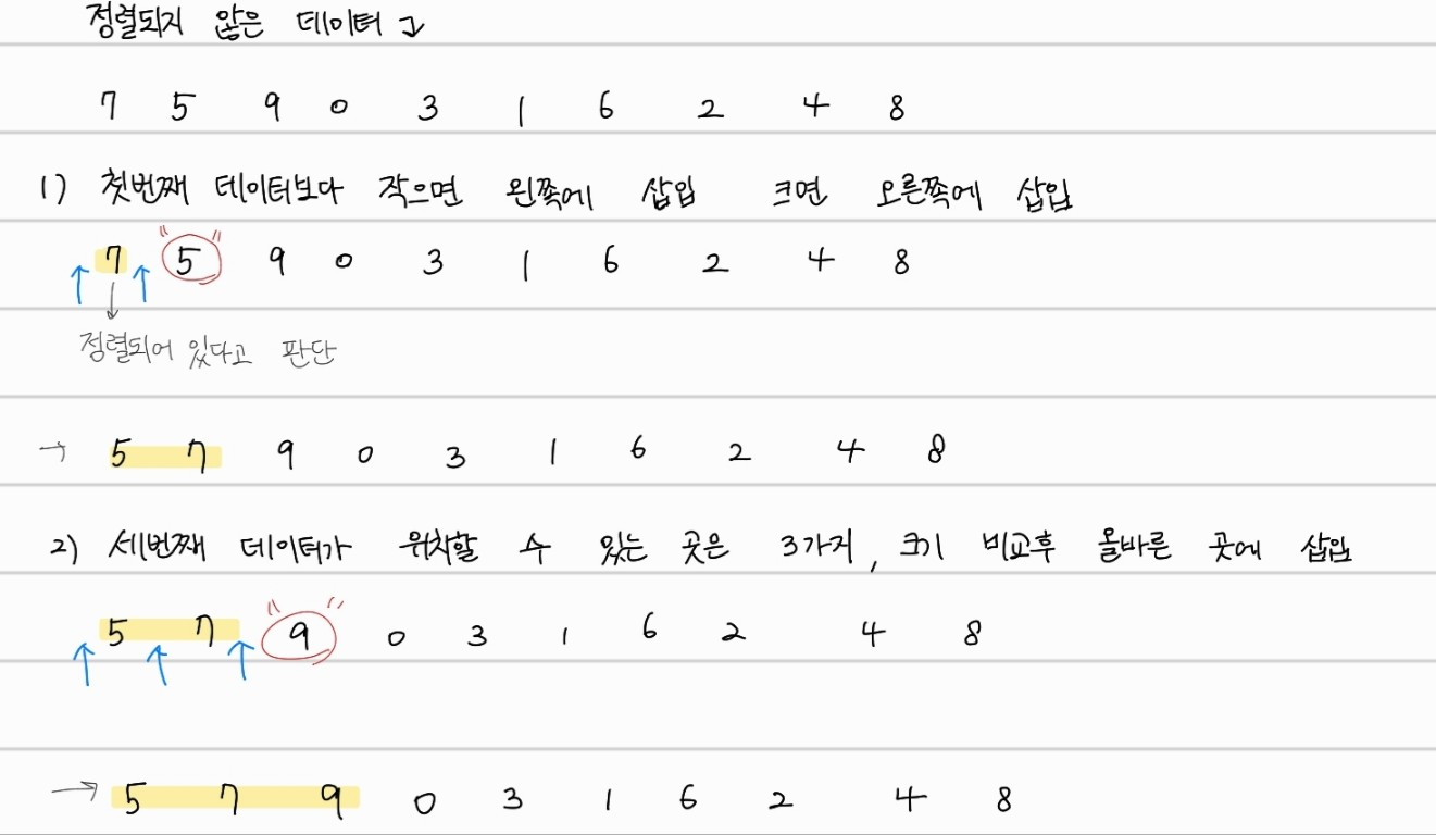 첫번째 데이터는 이미 정렬되어있다고 판단하고, 두번째 데이터부터 크기 비교후 삽입을 시작한다. 정렬이 진행되며, 데이터가 삽입될 수 있는 위치는 점점 늘어난다. 위는 오름차순으로 정렬하는 것을 기준으로 작성한 것이다.