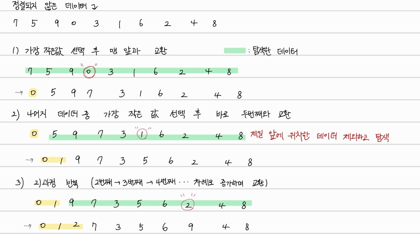 가장 작은 값이 위치할 인덱스를 i로 설정하고, i+1부터 데이터를 모두 탐색해 가장 작은 값을 i번째 인덱스와 교환하여 가장 작은 값을 i번째 인덱스에 위치시키는 것을 반복하는 것으로 정렬을 마친다.