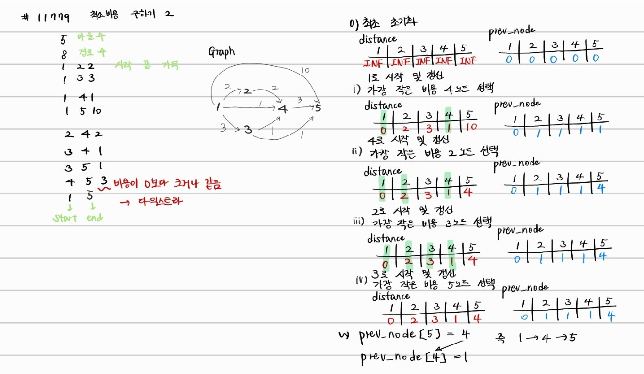 여기서 경로를 추가해줘야 한다. 최소 비용으로 한 노드까지 가는 경우는 cost를 distance에서 갱신할때마다 next_node의 prev_node(cur_node)를 계속 바꿔주면 된다.