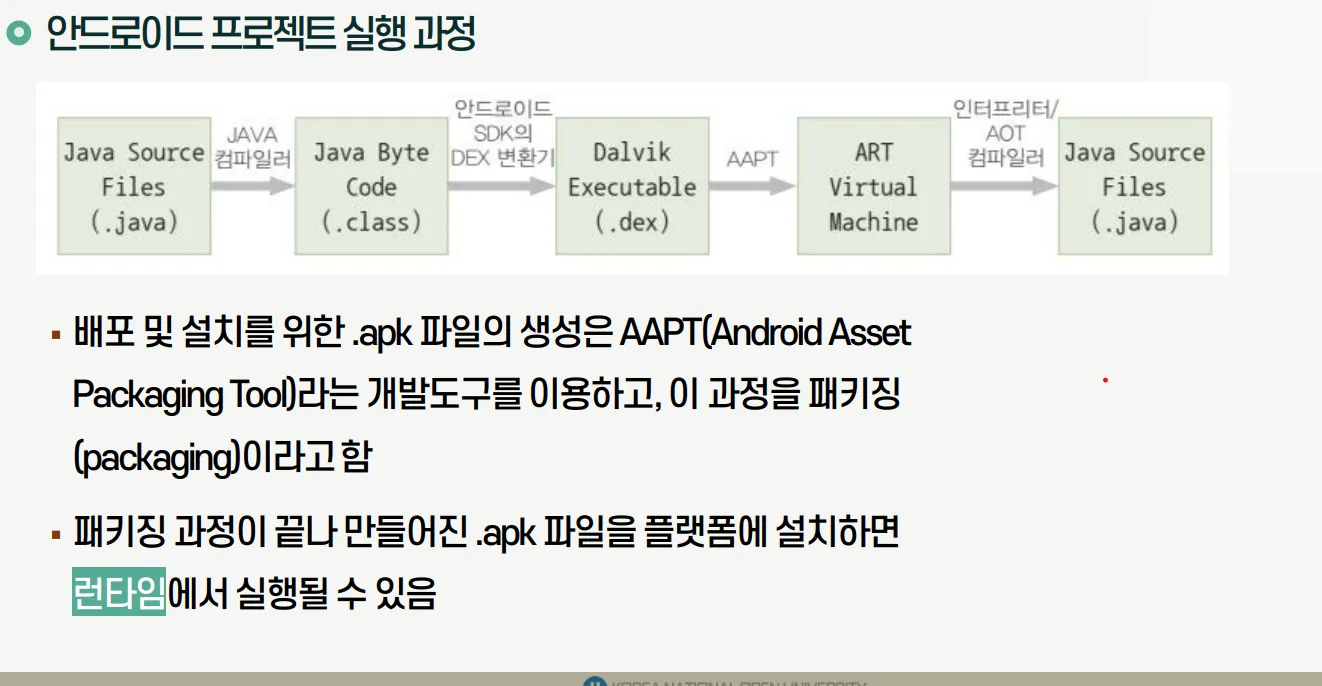 - 안드로이드앱은 .apk 파일 확장자로 패키징되어 배포됨
