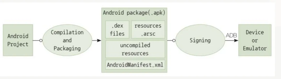 - 최종적으로 컴파일되지않은 리소스파일(이미지, 아이콘파일등)들과 .dex파일, resources.arsc파일, AndroidManifest.xml 파일이 함께 패키징되어 .apk 파일이 생성됨