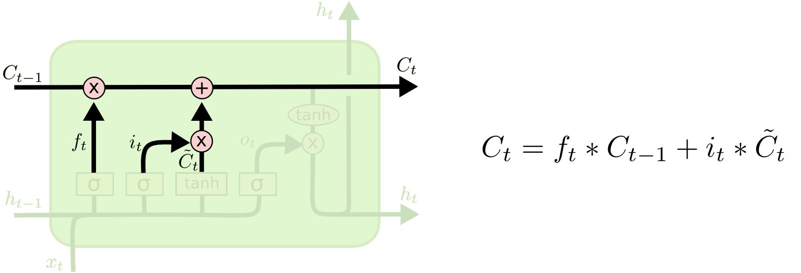 과거 Cell State를 새로운 State로 업데이트 하는 과정입니다. Forget Gate를 통해서 얼마나 버릴지, Input Gate에서 얼마나 더할지를 정했으므로 이 Update과정에서 계산을 해서 Cell State로 업데이트를 해줍니다.