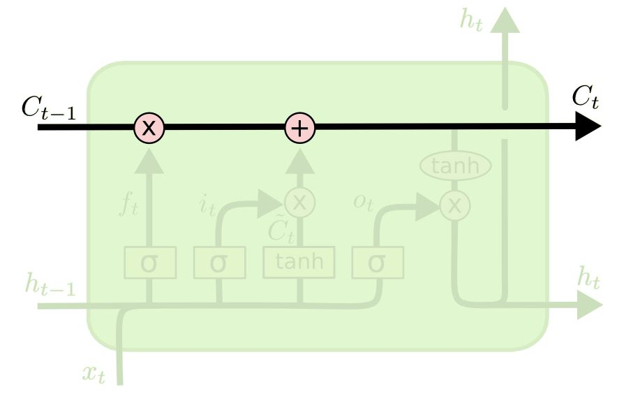 LSTM의 핵심 부분입니다. 모듈 그림 위에서 수평으로 이어진 윗 선에 해당합니다. Cell State는 컨베이어 벨트와 같아서 작은 linear interaction만을 적용시키면서 전체 체인을 계속 구동 시킵니다. 정보가 전혀 바뀌지 않고 그대로만 흐르게 하는 부분입니다. 또한 State가 꽤 오래 경과하더라도 Gradient가 잘 전파 됩니다. 그리고 Gate라고 불리는 구조에 의해서 정보가 추가되거나 제거 되며, Gate는 Training을 통해서 어떤 정보를 유지하고 버릴지 학습합니다.