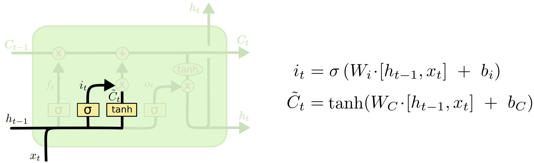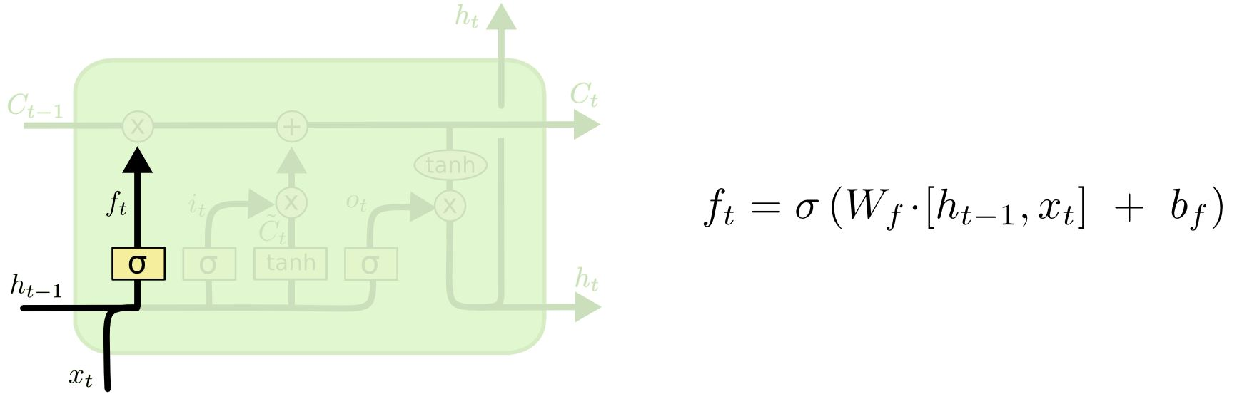 이 Gate는 과거의 정보를 버릴지 말지 결정하는 과정입니다. 이 결정은 Sigmoid layer에 의해서 결정이 됩니다. 이 과정에서는 과 를 받아서 0과 1 사이의 값을 에 보내줍니다. 그 값이 1이면 "모든 정보를 보존해라"가 되고, 0이면 "죄다 갖다 버려라"가 됩니다.