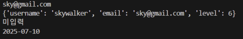 print("키", user_data.keys()) # dict_keys(['username', 'email', 'password'])