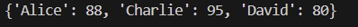 students = {"Alice" : 85, "Bob" : 90, "Charlie" : 95}