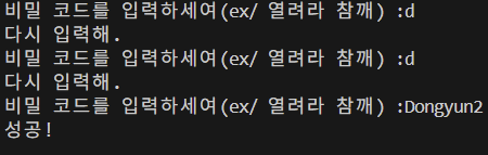 secret_code = input("비밀 코드를 입력하세여(ex/ 열려라 참깨) :")
