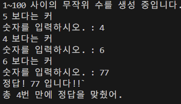 print("1~100 사이의 무작위 수를 생성 중입니다.")