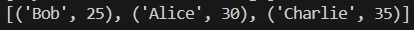 print(sorted(people, key = lambda x: x[1])) # [('Bob', 25), ('Alice', 30), ('Charlie', 35)]