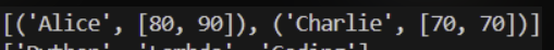 print(list(filter(lambda x: sum(x[1]) / len(x[1]) >= 70, students))) # [('Alice', [80, 90]), ('Charlie', [70, 70])]