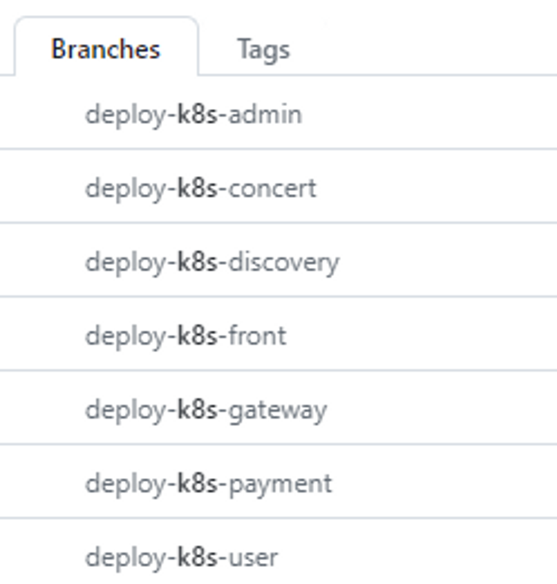 MSA로 개발하는 것은 하나의 서버를 여러 개로 나뉘어 개발하는 것이다. 기존에 Github에서 개발 브랜치를 하나만 사용했다면 다음과 같이 서버별로 브랜치를 생성해야한다. 왜냐하면 브랜치별로 배포를 하고 같은 브랜치에 있으면 다른 서버 수정사항이 계속 적용돼서 Pull/Push에 의도치 않은 파일을 받고 충돌이 발생할 수 있기 때문이다.