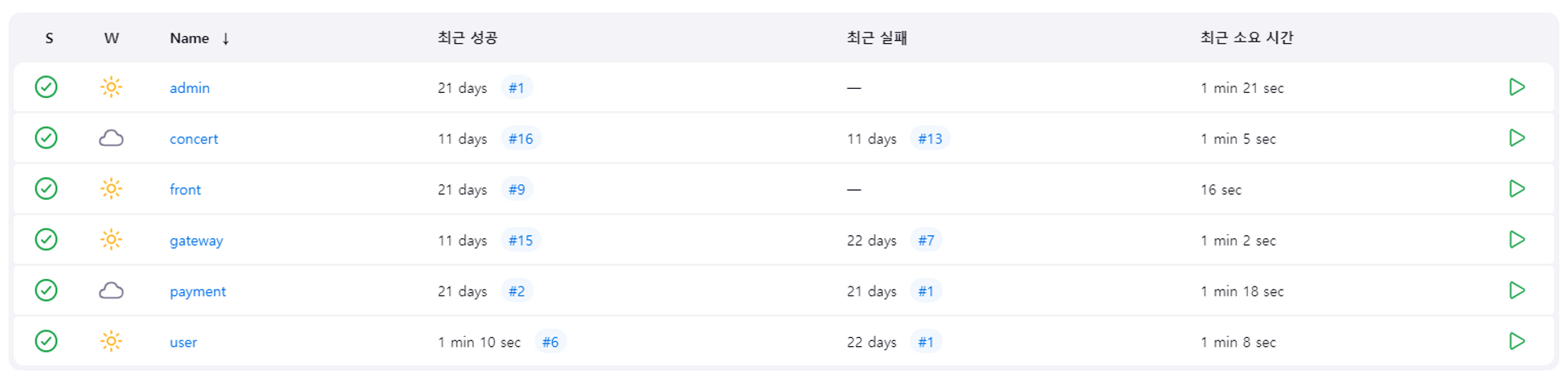 개발이 완료되면 배포를 해줘야 하는데 Jenkins 기준으로 모놀리식은 하나만 작성하면 되지만 MSA에서는 서버마다 Jenkinsfile을 작성해서 각각 Item을 생성해서 배포해야한다. MSA 단점이라고도 할 수 있는 관리해야할게 많아지는 단점이긴 하지만 한번 해두면 잘 안 바뀌고 분리해서 관리할 수 있다는 장점이 있다. Jenkinsfile 코드는 깃허브에 있습니다.