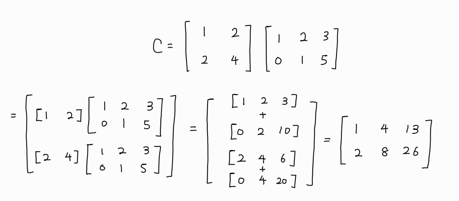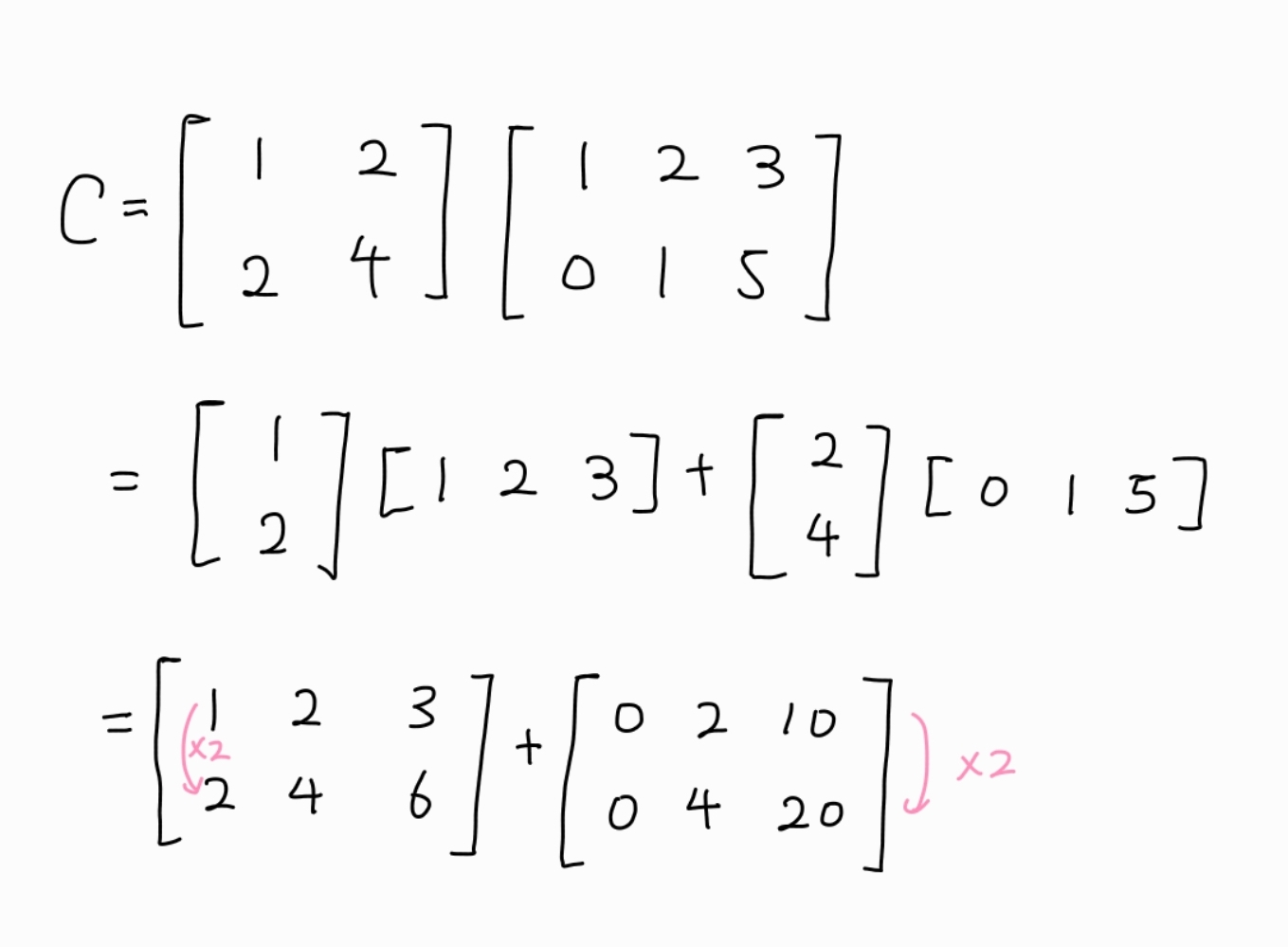 C=AB에서, A의 각 열벡터는 m×1이고 B의 각 행벡터는 1×p의 벡터이다. 따라서 A의 열벡터와 B의 행벡터를 곱하면 m×p가 되는데, 이를 이용해 행렬곱을 다음과 같이 표현할 수도 있다.