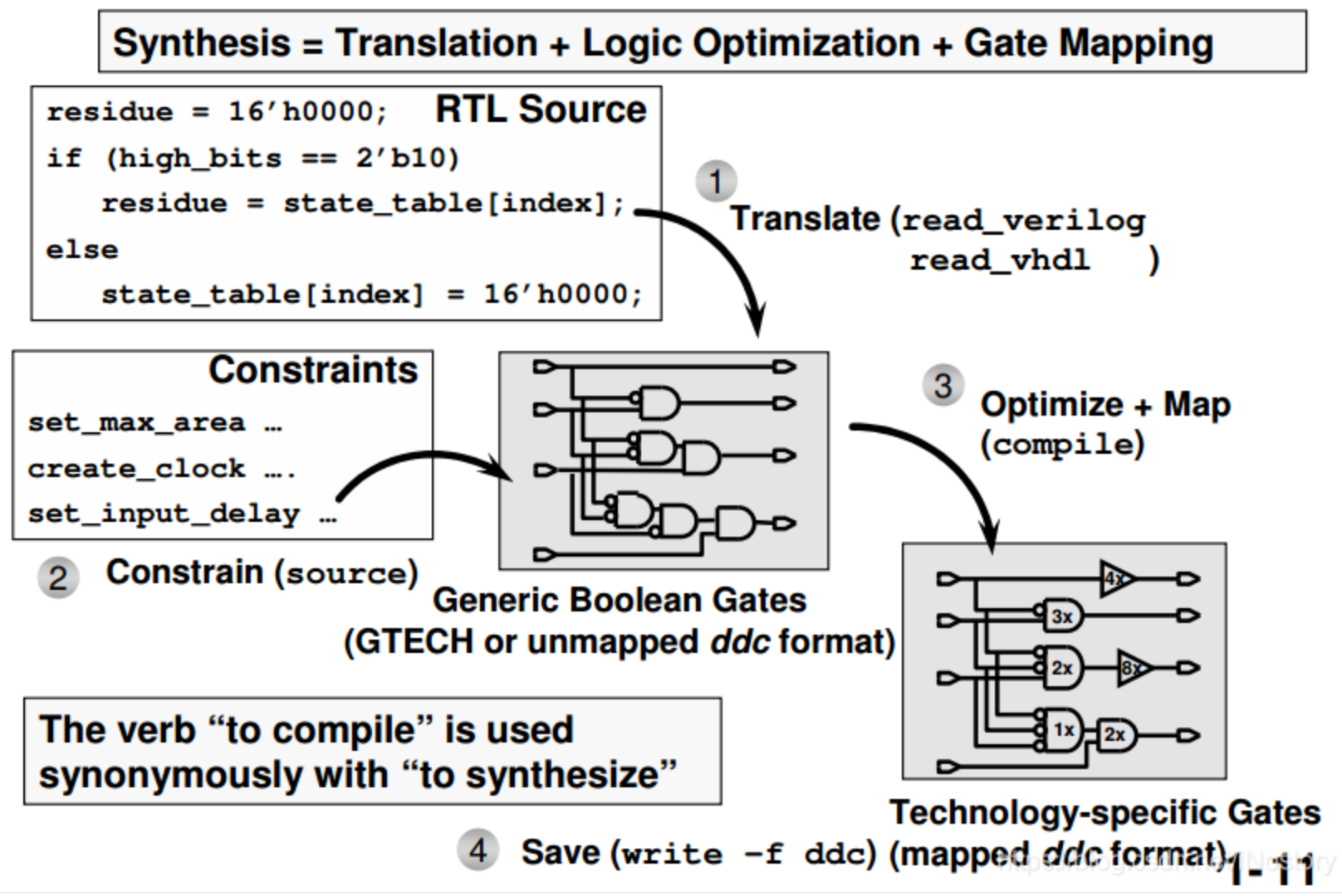 read_verilog : Verilog로 작성된 RTL 소스를 읽어들입니다.read_vhdl : VHDL로 작성된 RTL 소스를 읽어들입니다.read_sverilog : SystemVerilog로 작성된 RTL 소스를 읽어들입니다.이 과정에서는 RTL 소스가 GTECH 형태의 일반적인 불린 게이트로 변환됩니다. 이 상태는 아직 특정 기술 라이브러리와 매핑되지 않은 상태(unmapped ddc format)이라고 합니다.