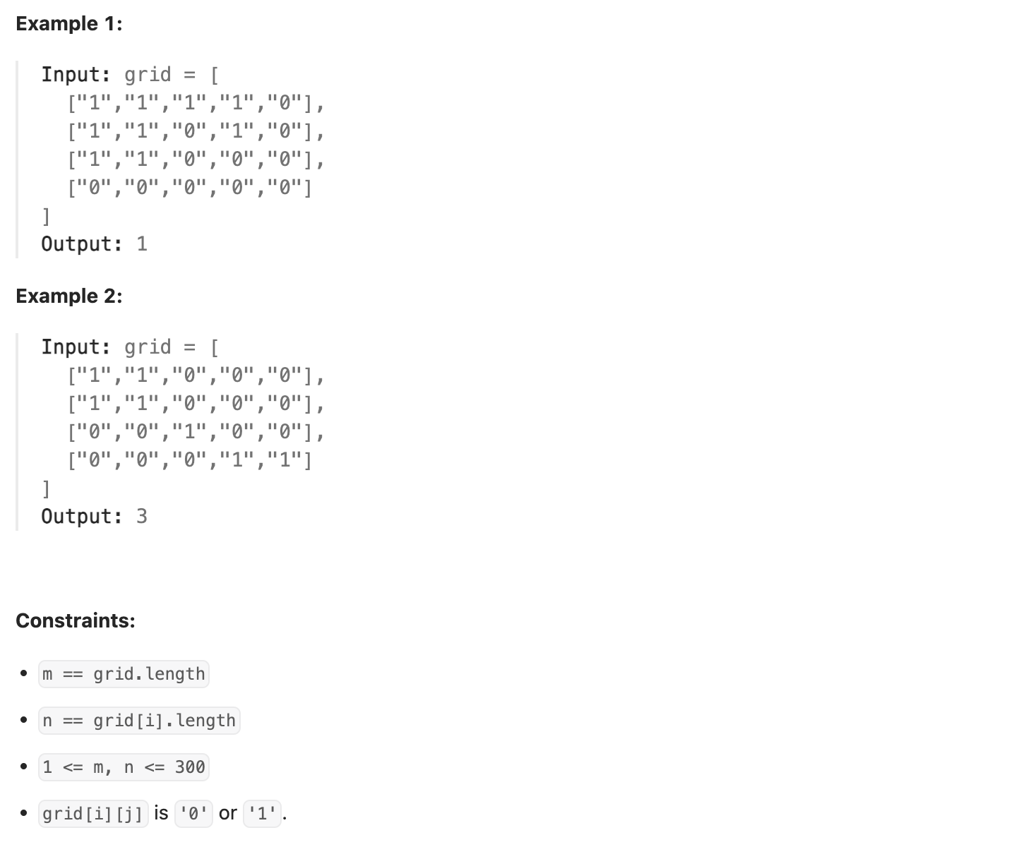 Given an m x n 2D binary grid grid which represents a map of '1's (land) and '0's (water), return the number of islands.