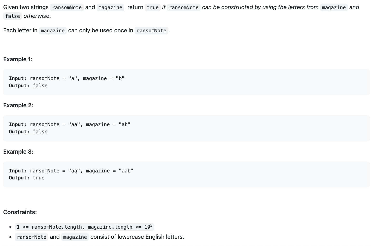 cnt as the inventory (multiset) of characters in magazineransomNote, decrement cnt[ch] for each charFalse immediatelyTrueclass Solution: