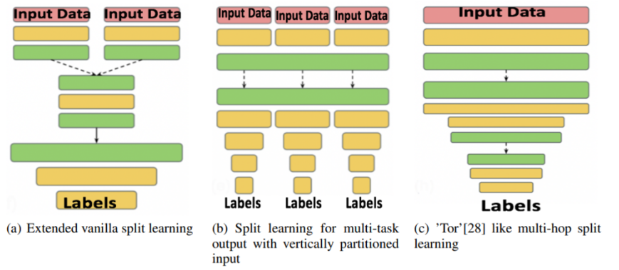(c) client 가 sequential 하게 있는 구조로 cut layer까지 훈련시킨 후 다른 client가 이를 받아 마저 훈련시키는 방식을 택한다